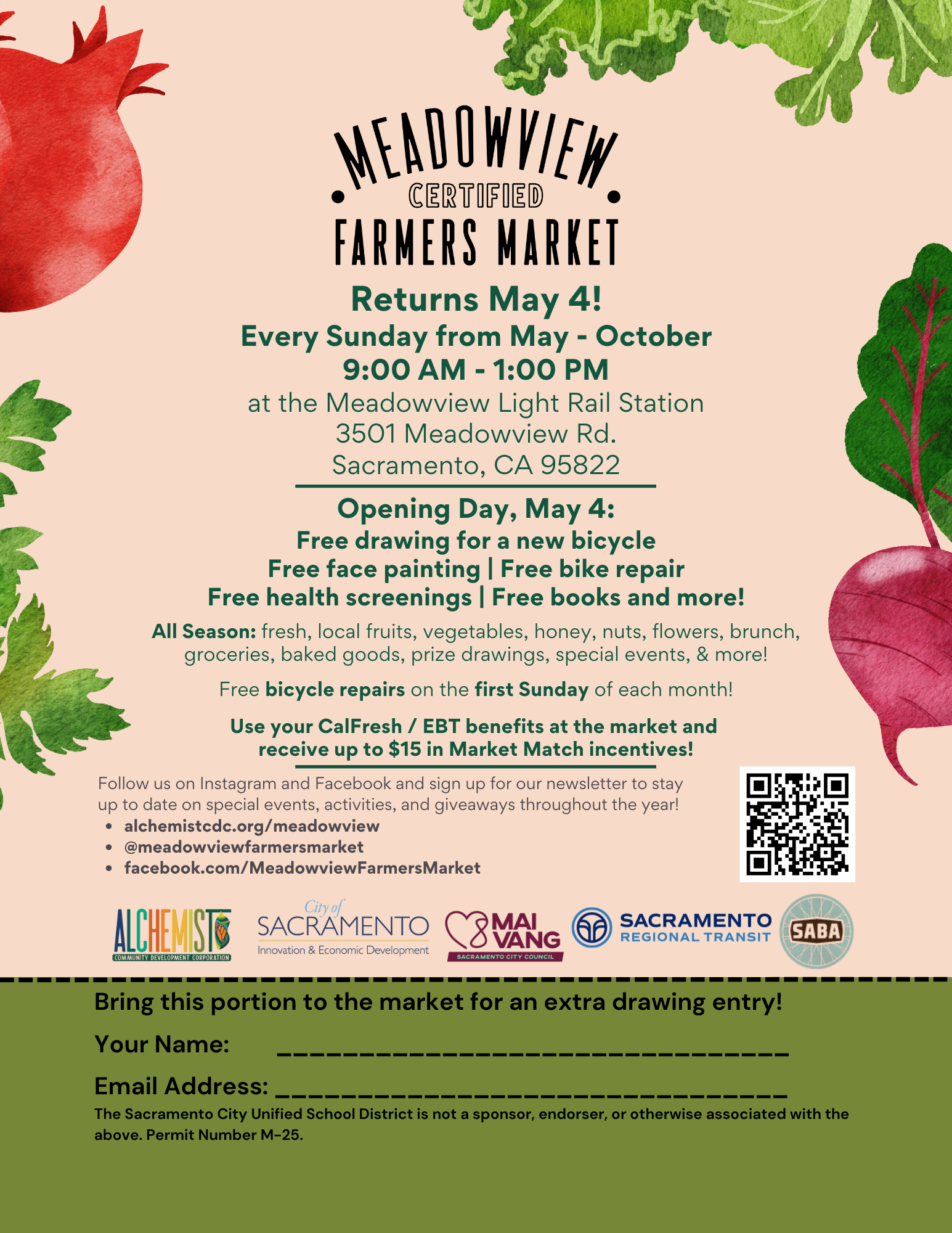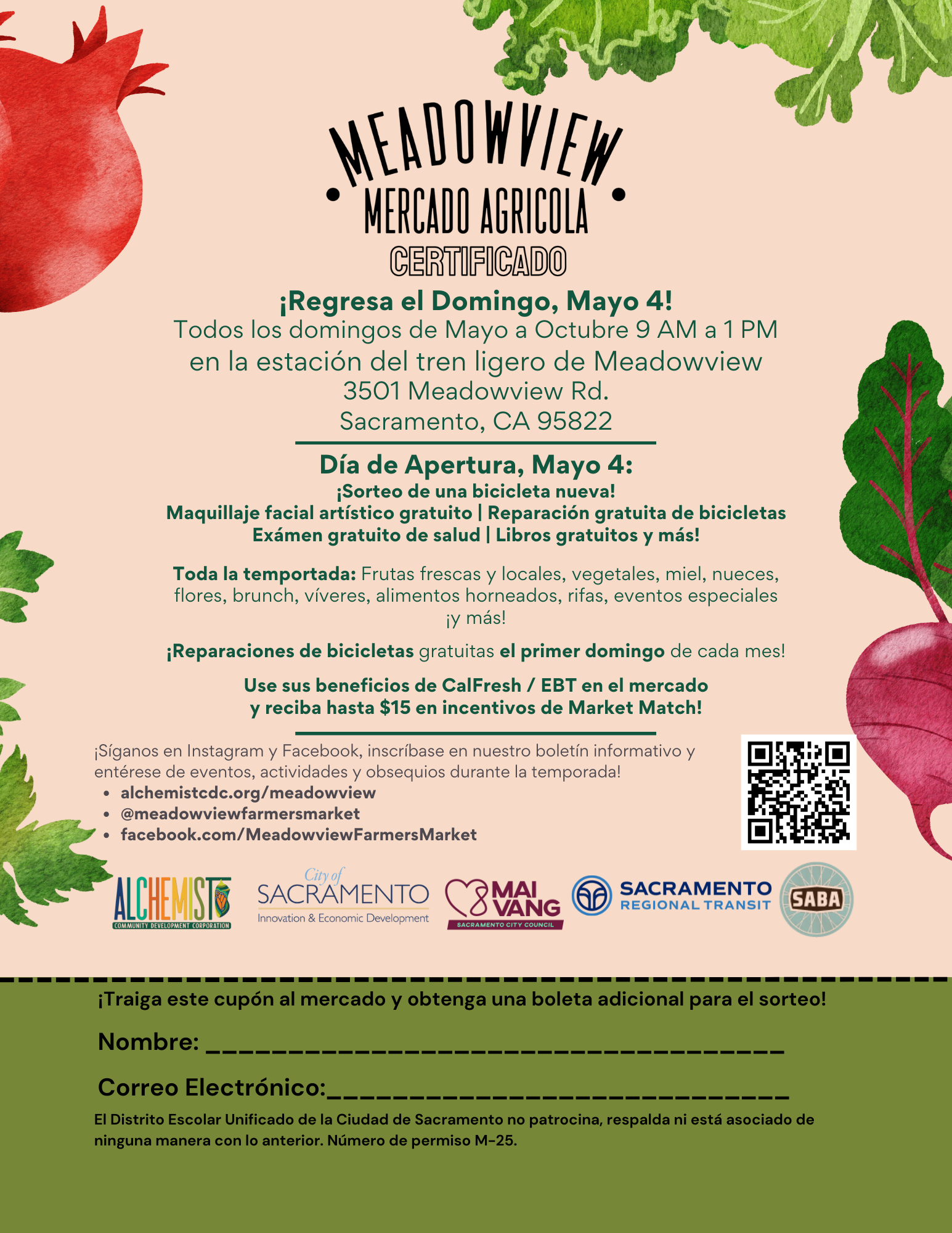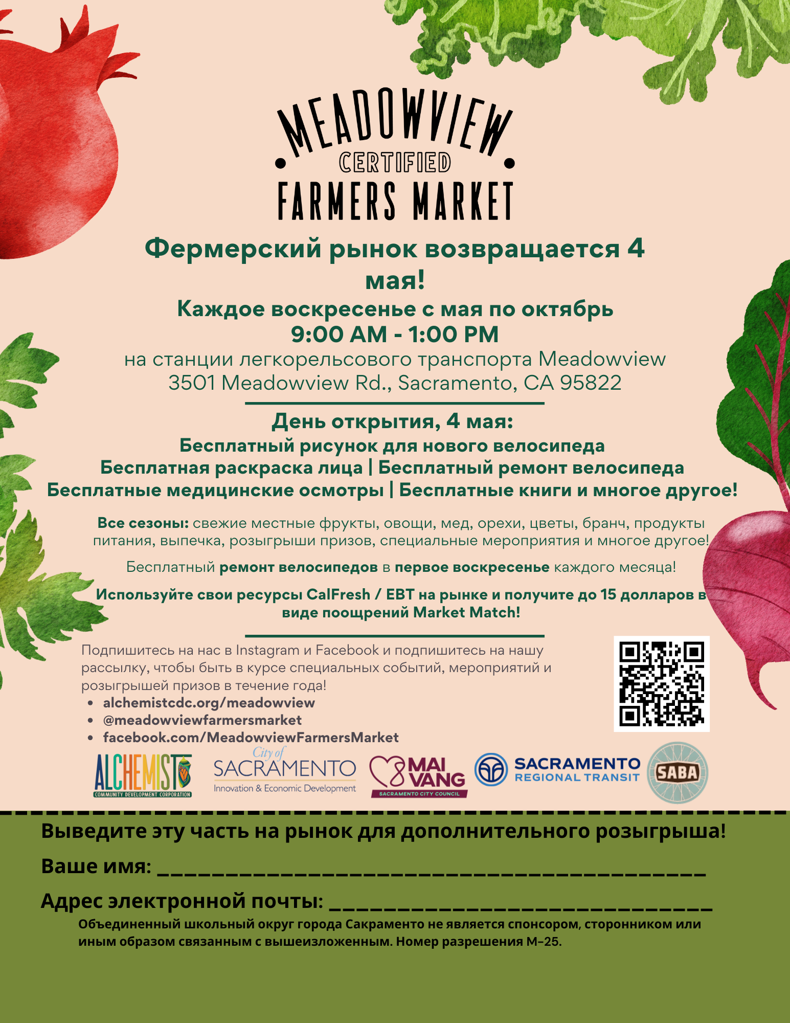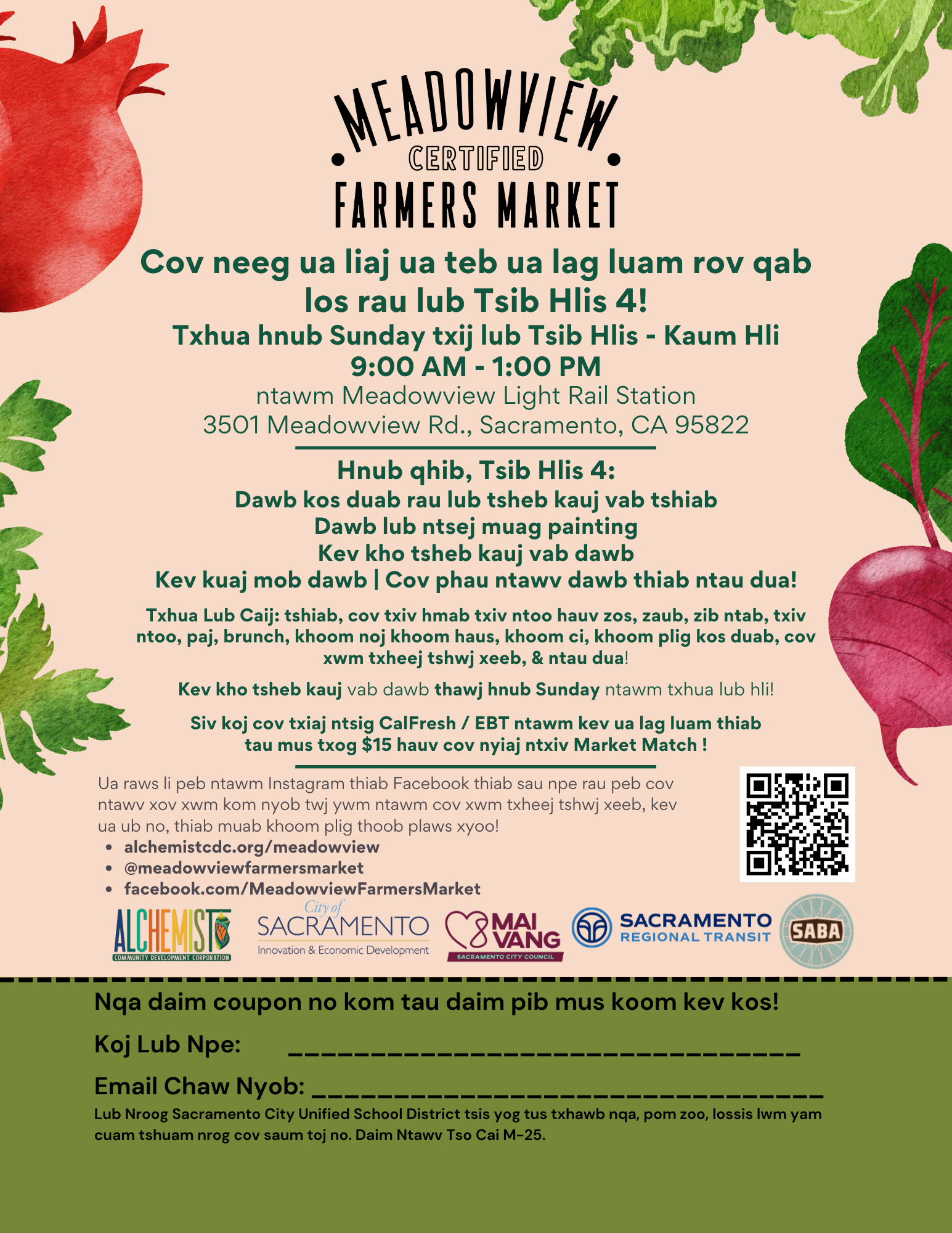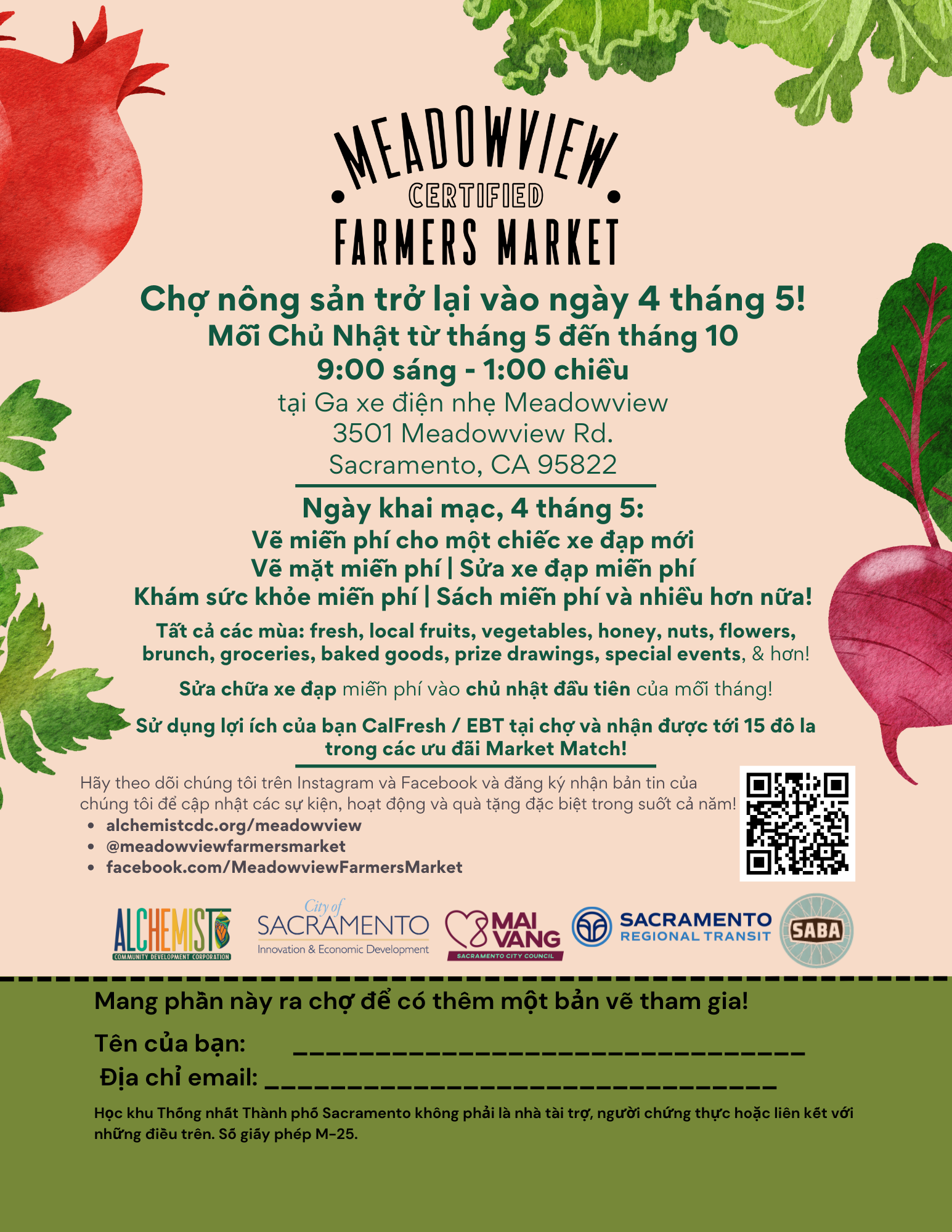 Below, you will find translated versions of the Meadowview Certified Farmers’ Market flyer. Please note, most of these translations were completed using digital tools and may not be completely accurate.