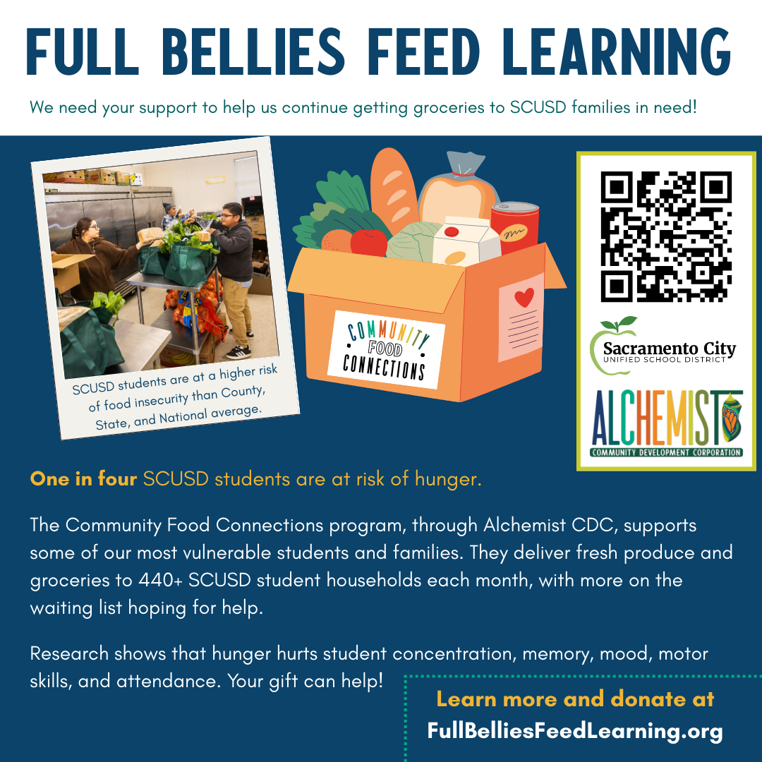 Help us fight hunger in the Sacramento City Unified School District (SCUSD)! Community Food Connections is a program of Alchemist CDC that bridges gaps in the food system to get groceries to local SCUSD families of school children who are the most vulnerable to hunger. As of November 2025, we are helping 1,600 neighbors across 36 campuses each month! That’s 1,200 children and 400 care-givers and family members who receive groceries every 1 or 2 weeks! With your help, we can feed even more families!